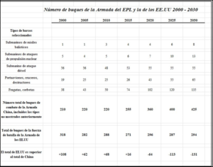 El siguiente cuadro de número de buques de la Armada del EPL muestra un notorio crecimiento desde el año 2015 con relación al número total, alcanzando la cifra de 255, mientras que Estados Unidos tenía aproximadamente 271. Las cifras chinas aumentaron considerablemente para el año 2020 debido al crecimiento de 360 buques frente a los 296 estadounidenses. Esto nos demuestra que, entre los años 2016-2019 un incremento del 41% de la flota china, mientras que para el tramo 2020-2025 el porcentaje alcanzó un 11%, tomando en cuenta los 360 buques construidos en el año 2020, y los 400 que se alcanzó en el año 2025. Si tomamos en cuenta la cantidad de buques producidos en la década de los años 2015-2025, el aumento desarrollado por parte de China es de un 57%. Por su parte Estados Unidos, pasó de producir 271 buques en el año 2015 a 296 en el año 2020 representando un incremento de un 9%, mientras que, las cifras descienden a 287 buques para el año 2025, lo que indica un descenso del 3%. Ahora bien, si observamos el porcentaje total de la producción norteamericana de buques en la década 2015-2025, las cifras alcanzan un 6%. Esto significa que, sin lugar a duda, China logró dar un salto por lo menos cuantitativo en materia de producción bélica naval, esto en parte se debe a nuevas prácticas asociadas con empresas, así como el desarrollo tecnológico desarrollado hasta el momento.