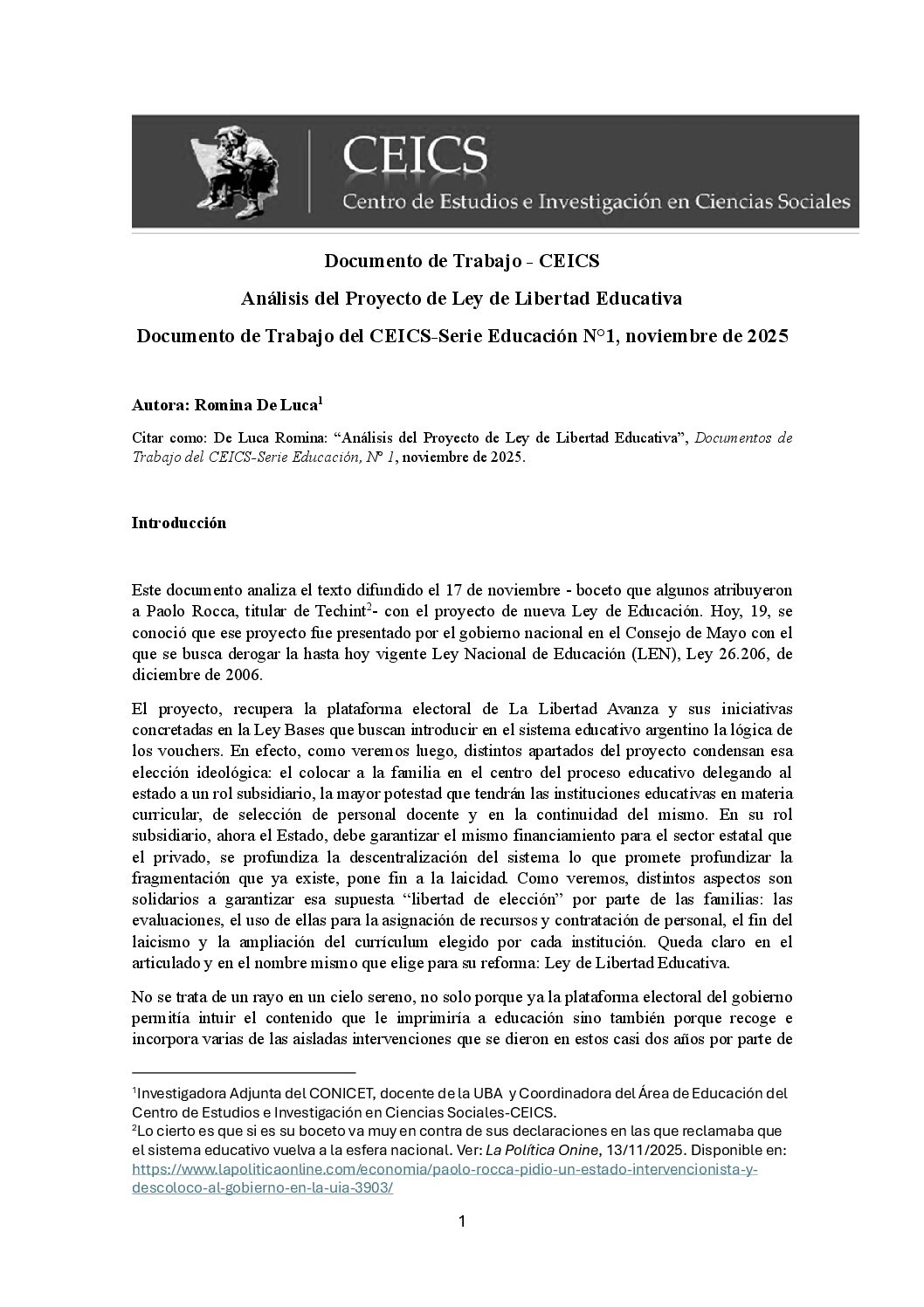 Documento de Trabajo del CEICS-Serie Educación N°1, noviembre de 2025 Autora: Romina De Luca[1] Citar como: De Luca Romina: “Análisis del Proyecto de Ley de Libertad Educativa”, Documentos de Trabajo del CEICS-Serie Educación, N° 1, noviembre de 2025. [1]Investigadora Adjunta del CONICET, docente de la UBA y Coordinadora del Área …